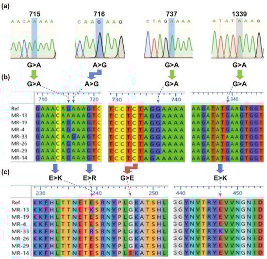 The detected variations in the mecA gene in the MRSA isolates (MR-13, -19, -4, -33, -26, -29, and -14). (a) Chromatograms showing nucleotide substitutions at different locations. (b) Multiple DNA sequence alignment. (c) Multiple protein sequence alignment. The sign “>” represents a substitution mutation. The left “E>K”, “E>R”, “G>E”, and the right “E>K” refer to E239K, E239R, G246E, and E447K, as shown by the dashed arrows. The left “G>A”, “A>G”, and “G>A”, and the right “G>A” refer to G715A, A716G, G737A, and G1339A. “Ref” represents the reference sequence (GenBank accession no. NC_002745). The MRSA isolates (MR-13, -14, and -33) show amino acid substitution(s) in PBP2a.