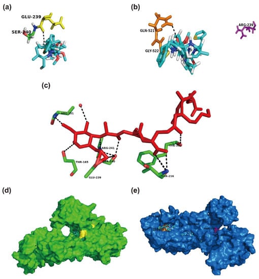 The protein-ligand docking of cefoxitin with the wild-type PBP2a and E239R-mutant PBP2a of MRSA. (a) Cefoxitin (shown in capped sticks with carbon in cyan, oxygen in red, nitrogen in blue, and sulfur in yellow) interacts with the Glu-239 (E239, yellow) of the wild-type PBP2a. The docked ligand trajectory shows that cefoxitin is located in close proximity to E239. (b) Cefoxitin interacts with Gln-521 (orange) and Gly-522 (orange) instead of Arg-239 (R239, pink) in the E239R-mutant PBP2a. (c) Peptidoglycan (red, GlcNAc-MurNAc pentapeptide) interacts with E239 and other residues of the wild-type PBP2a. (d) Surface representation of the wild-type PBP2a (green) showing that the ligand (shown in caped sticks) is positioned at the allosteric site (yellow). (e) The ligand (shown in capped sticks) is pointed away from the allosteric site (pink) in the E239R-mutant PBP2a. All of the interactions are shown as black dashed lines. Glu, glutamic acid; Ser, serine; Gln, glutamine; Gly, glycine; Arg, arginine; Thr, threonine; Tyr, tyrosine; Lys, lysine.