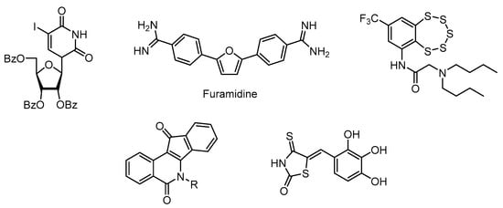 DNA in living organisms is constantly exposed to a variety of physical and chemical stresses, and damage occurs as a result. Bulk DNA damage is caused by UV light and environmental mutagens, and X-rays cause DNA double-strand breaks. Defects in the repair of DNA damage are implicated in a variety of diseases, many of which are typified by neurological dysfunction and/or increased genetic instability and cancer []. Traditional cancer chemotherapy is aimed at damaging the DNA of malignant cells, and the results depend on the effectiveness of their repair systems. Recently, compounds that act as DNA repair inhibitors have been considered as potential drugs [,]. The enzyme tyrosil-DNA-phosphodiesterase 1 (TDP1) is one of the promising ones []. This enzyme is an important supplementary target for anticancer therapies based on topoisomerase inhibitors 1 (TOP1), since it plays a key role in the removal of TOP1-DNA adducts stabilized by TOP1 inhibitors such as camptothecine [] and its clinical derivatives []. TDP1 is also capable of hydrolysing apurinic sites, and thus leading to their repair. This may be the key activity needed for the repair of DNA damage caused by antitumour alkylating drugs such as temozolomide (TMZ), as well as ionising radiation []. Thus, the inhibition of TDP1 activity may significantly enhance the therapeutic effect of some anticancer agents. SCAN1 is a natural mutant of TDP1 where His493 is replaced with Arg493 in the binding pocket []. The mutation changes the geometry of the enzyme active site, and the enzyme remains covalently bound to DNA. This mutation leads to a severe neurodegenerative disease spinocerebellar ataxia syndrome with axonal neuropathy (SCAN1). It is currently suggested that the pathology is caused by the accumulation of the SCAN1-DNA covalent cleavage complexes []. It is assumed that nerve cells especially suffer from the accumulation of such adducts due to their nonproliferative nature leading to the progressive accumulation of unrepaired DNA lesions []. Therefore, suppression of SCAN1 activity could potentially improve the SCAN1 patients’ condition and prevent the progression of the disease. The search for inhibitors of key DNA repair enzymes is a promising area of medical chemistry, as it represents one of the ways to design effective therapies for cancer, as well as cardiovascular and neurodegenerative diseases. Recently, a number of TDP1 inhibitor structural classes have been studied, including pyrimidine nucleosides [], furamidine [], compounds with benzopentathiepine moiety [], indenoisoquinolines [], and 5-arylidenethioxothiazolidinones [] (Figure 1).