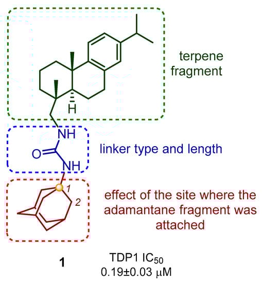 Our group previously obtained a set of ureas and thioureas based on the natural terpenoid dehydroabietylamine []. These compounds are able to inhibit TDP1 in the submicromolar range. They also lack toxicity against different cell lines in concentrations up to 100 μM. For the first time, we have shown that dehydroabietylamine TDP1 inhibitors in combination with TMZ demonstrate a better cytotoxic effect on glioblastoma cells than TMZ alone, taken at the same concentration. Compound 1 (Figure 3), which has a fragment of resin acid and adamantane, was an efficient inhibitor of TDP1 activity in vitro, and enhanced the cytotoxic effect of TMZ on glioblastoma cells. We synthesised a series of dehydroabietylamine derivatives containing the heterocyclic fragment 2-thioxoimidazolidin-4-ones and studied their activity against TDP1 []. It is important to note that not all of the synthesized heterocyclic derivatives are suitable for studying inhibitory activity, as some of the substances proved to be extremely insoluble. In addition, the combination of an adamantane fragment with terpenes of various structures has been shown to be successful in identifying new inhibitors of the TDP1 repair enzyme [,,,,]. Since the combination of a terpene resin acid backbone with an adamantane fragment in compound 1 proved to be most successful and the compound had the most important biological properties, we set out in the present study to synthesise analogues of compound 1 to examine their structural activity. The design of the target derivatives is shown in Figure 3. It includes the variations of the linker type and length, diterpene, and adamantane moieties. Understanding which structural blocks are most important for the target biological activity and whether more active agents can be obtained by available synthetic methods is the main goal of the presented work.