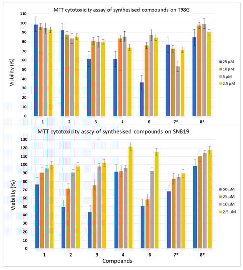Individual cytotoxicity of studied compounds in the T98G and SNB19 glioma cell lines. * Compounds 7 and 8 formed visible micelles when stock solutions were dissolved in a cell growth medium, as shown by light microscopy. The cytotoxicity of these compounds was studied; however, the concentrations of their solutions may be significantly different from those indicated in dilutions.