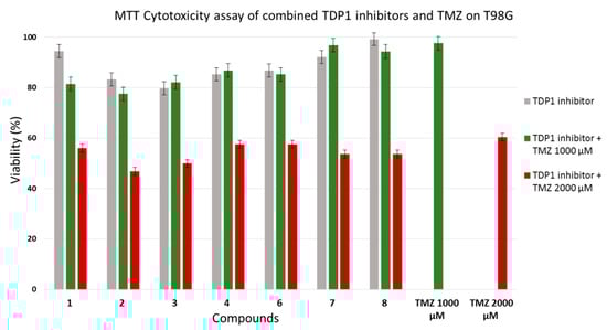 To investigate the cytotoxicity of combinations of the studied compounds with TMZ, we combined 5 µM concentrations of each with 1000 µM or 2000 µM of TMZ and compared their toxicity with 1000 µM and 2000 µM of TMZ alone. At 1000 µM, TMZ was almost non-toxic to our cell culture, with ~95% of cells surviving the treatment. Adding 5 µM of the compounds to 1000 µM of TMZ did not increase the cytotoxicity to the glioma cells. Higher cytotoxicity was obtained with 2000 µM of TMZ, which inhibited cell viability by ~40%. Combining the compounds with 2000 µM of TMZ resulted in considerably higher toxicity (i.e., an increase of 5–15%) compared with TMZ alone, which indicated the additive profile of the action of TDP1 inhibitors with TMZ. The effects of combinations of dehydroabietylamine derivatives 1–4 and 6–8 with TMZ on T98G viability are shown in Figure 5.