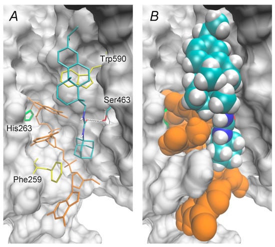 The reaction catalyzed by TDP1 proceeds in two steps: the nucleophile His263 residue attacks the 3′-phosphotyrosyl bond of the substrate, and the His493 residue activates the water molecule to cleave the covalent intermediate [,,]. This offers two potential therapeutic strategies: (1) the inhibition of the first step to prevent the formation of the 3′-phosphohistidine intermediate; and (2) the inhibition of the second step to prevent the intermediate hydrolysis [,]. Using molecular docking, we tested the discussed resin acid derivatives against both the molecular model of the apo form and that of the covalent intermediate. The inhibitors were found to bind preferentially to the intermediate structure, as demonstrated in Figure 6.