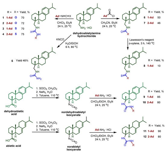 The synthetic route for obtaining compounds 1–12 is shown in Scheme 1. A set of ureas and thioureas 1–4 was obtained by the interaction of dehydroabietylamine hydrochloride with 1- and 2- adamantyl isocyanates and isothiocyanates. The starting isocyanates and isothiocyanates were synthesized using the methods described earlier. In particular, 1-adamantyl isocyanate was obtained by the Curtius rearrangement of 1-adamantyl acyl azide formed in situ by interaction of corresponding acyl chloride with sodium azide []. Isomeric 2-adamantyl isocyanate was synthesized by the reaction of 2-adamantylamine hydrochloride with triphosgene in the presence of sodium hydrocarbonate, with dichloromethane used as a solvent []. Refluxing of 1-adamantaneamine with phenyl isothiocyanate in dry toluene resulted in 1-adamantane isothiocyanate []. To obtain 2-adamantyl isothiocyanate, 2-adamantaneamine hydrochloride was treated by triethylamine followed by carbon disulfide and DMAP/Boc2O subsequently []. For the present study, we re-synthesised compound 1, which previously showed the best inhibitory characteristics and the ability to enhance the cytostatic properties of TMZ. Monosubstituted urea 5 was prepared by treating dehydroabietylamine hydrochloride with potassium cyanate. Amide and thioamide groups were considered as another variant of linker structurally similar to the ureas. The target amides 6 and 7 were obtained from dehydroabietylamine hydrochloride and 1- and 2-adamantanecarbonyl chlorides. The amide group of compound 6 was converted to thioamide using Lawesson’s reagent. The reaction proceeded under harsh conditions. Refluxing in toluene led to the formation of thioamide 8. Compound 8 was isolated individually with a small yield. When the reaction was carried out in lower boiling solvents, the target product was not detected, even after a long period.