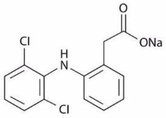 Non-steroidal anti-inflammatory drugs (NSAIDs) are a broad family of compounds which are commonly used for the treatment of inflammation and pain. Diclofenac ([2-(2,6-dichloroanilino)phenyl]acetic acid) is one of the most widely used NSAIDs commonly used for the treatment of rheumatoid arthritis, osteoarthritis, ankylosing spondylitis, and musculoskeletal and sports injuries, as well as for the relief of dysmenorrhea and postoperative pain [1,2,3,4,5,6]. It is typically found as sodium or potassium salt and it is available in a variety of drug formulations including tablets, capsules, ophthalmic drops, suppositories, and ointments, depending on the site of application. Diclofenac sodium (DS) (Figure 1) is primarily used for its anti-inflammatory properties and acts at a slower pace than potassium salt which is readily absorbed by the body and provides instant relief [7].