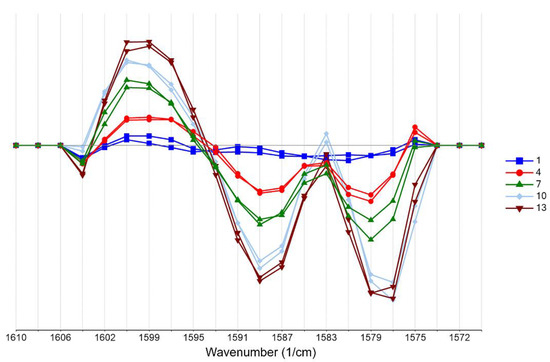 Second derivative differentiation coupled with seven smoothing points (Savitzky–Golay) was applied to the spectra of the training set to enhance resolution and eliminate possible linear baseline drift between samples (Figure 2). Second derivative spectroscopy has the advantage of producing sharp vibration bands while offering resolution enhancement of overlapping peaks. However, as differentiation increases, the signal noise is typically combined with a Savitzky–Golay filter. The spectra analysis focused on the region ~1600–1500 cm−1, which is assigned to the –COO- group. As can be seen in Figure 2 and Figure 3, differences owing to the DS concentration changes of the training set (standard solutions, 1–13 g/L) are apparent in this region (region of interest).