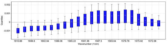 Boxplots (quantiles) of the training set. The maximum intensity deviation is observed in the region 1595–1575 cm−1.