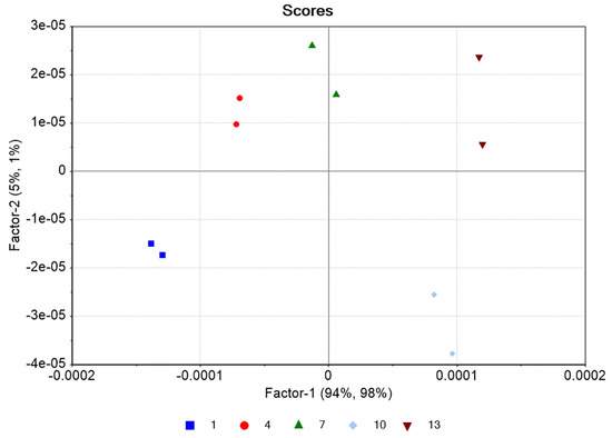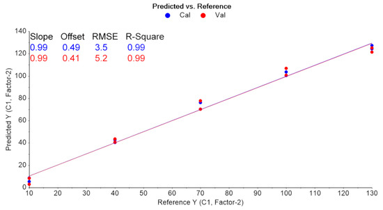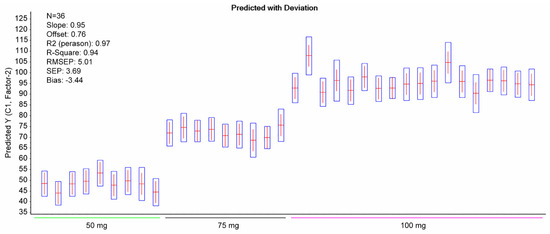 PLS regression analysis with leave-one-out cross-validation resulted in the scores plot depicted in Figure 4, where only two factors explain most of the variance. Using two-factors analysis, the leave-one-out cross-validation procedure yielded a correlation coefficient equal to R2 = 0.99, with a root mean square error (RMSE) of approximately 5% (Figure 5). The histogram of the residuals (Figure S2 of the Supplementary Material) shows that the data are not skewed. Therefore, the constructed prediction model correctly classifies the training set samples for the cross-validation, while the standard error of calibration (SEC) reveals minimum bias. The developed PLS model was applied to the test set spectra (N = 36), and the results are shown in Figure 6, where the predicted values are depicted with deviation. The numerical predicted concentrations are given in Table 1 and Table S1 of the Supplementary Material.