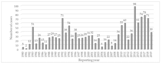 Over 75% of the cases reported for cephalosporins over the years have come from spontaneous reports. Although not constant, there was a general increase in the trend of reporting from 1980 to 2018 with several peaks, the highest one being in 2014 (Figure 1).