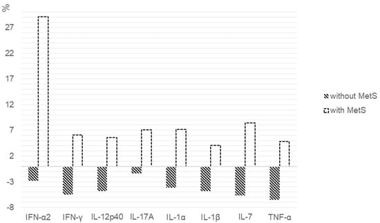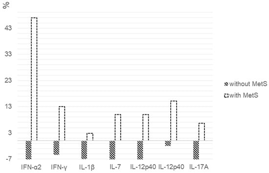 When assessing the percentage of changes in the cytokines levels between patients with MetS and without it, statistically significant differences in the IFN-α2 (p = 0.028), IFN-γ (p = 0.007), IL-12p40 (p = 0.007), IL-17A (p = 0.009), IL-1α (p = 0.011), IL-1β (p = 0.008), IL-7 (p = 0.004) and TNF-α (p = 0.031) level were found (Figure 1).