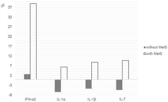The percentage changes in the cytokines levels, as shown in Figure 2. We found statistically significant differences in the IFN-α2 (p = 0.047), IL-1α (p = 0.017), IL-1β (p = 0.017) and IL-7 (p = 0.047) levels between the patients with and without MetS.