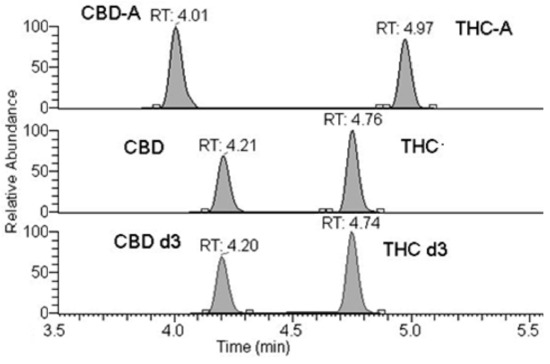 Chromatographic peaks and retention times of CBD, CBD-A, THC and THC-A and deuterated internal standards.
