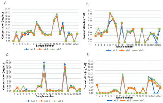 Concentration (mg/mL) of THC (A), CBD (B), THC-A (C) and CBD-A (D) measured on 23 galenic preparations in the three laboratories during cross-validation.