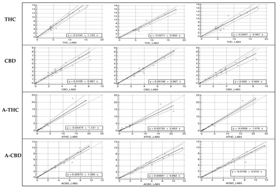 Passing–Bablok correlation plots of the cannabinoid concentrations, obtained in the three laboratories are shown in Figure 3.