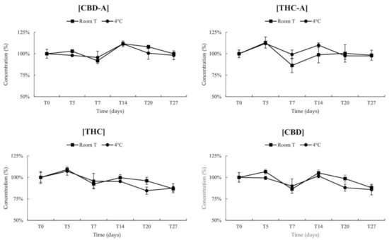 The stability of cannabinoids was assessed on a single batch of FM2 stored at room temperature (25 ± 2 °C) or at 4 ± 3 °C in the dark analyzed in triplicates at the following timepoints: 5, 7, 14, 20 and 27 days. As suggested by EMA guidelines, samples were considered stable if the percentage difference, calculated as the ratio between the concentration measured at each sampling point and the initial concentration, was lower than 15% [24].