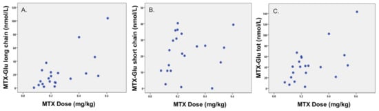 - Becker, M.L.; Van Haandel, L.; Gaedigk, R.; Lasky, A.; Hoeltzel, M.; Stobaugh, J.; Leeder, J.S. Analysis of Intracellular Methotrexate Polyglutamates in Patients with Juvenile Idiopathic Arthritis: Effect of Route of Administration on Variability in Intracellular Methotrexate Polyglutamate Concentrations. Arthritis Rheum. 2010, 62, 1803–1812. [Google Scholar] [CrossRef] [PubMed]