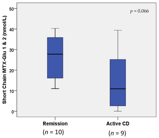 MTX-Glun concentrations were not statistically different between children with IBD in remission vs. active disease (p > 0.1; data not shown). However, when MTX-Glun concentrations were compared only in children with Crohn’s disease (n = 10 remission vs. n = 9 active), an increase greater than two-fold in short-chain MTX-Glu1–2 concentrations (nmol/L) was observed in remission (27.77 (16.10, 35.90)) vs. active Crohn’s disease (10.90 (2.60, 25.20)), approaching statistical significance (p = 0.066; Figure 2). The two Crohn’s disease study groups were receiving comparable dosing of both MTX (0.20 (0.17, 0.23) vs. 0.23 (0.15, 0.45) mg/kg weekly) and IFX (9.24 (7.45, 10.04) mg/kg every 4.0 (4.0, 6.0) weeks vs. 9.56 (8.49, 10.03) mg/kg every 5.0 (4.0, 6.0) weeks); p ≥ 0.554 (Table 2). Median and IQR IFX troughs (μg/mL) were within therapeutic range (i.e., ≥3–7 μg/mL [9]) in both groups, and not statistically different between groups (25.28 (5.35, 38.96) vs. 15.54 (7.11, 24.15)); p = 0.540 (Table 2). However, when IFX was included as a covariate in a logistic regression model, the differences in short-chain MTX-Glun between remission and active Crohn’s disease became less apparent (p = 0.130).