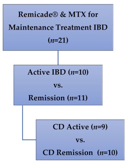 Patients: Children enrolled in a cross-sectional study of IFX monotherapy vs. combination IFX therapy with concurrent immunomodulators, and receiving medication doses in accordance with prescriber preference for clinical care of IBD [20], were included in this secondary analysis. All participants were enrolled at a single outpatient infusion center at the Children’s Mercy Hospital (Kansas City, MO, USA). Only patients receiving therapy with both IFX (Remicade®) and MTX were included in this secondary analysis (Figure 3), with maintenance dosing defined as no changes in dose or interval of either drug for at least two IFX infusion cycles.