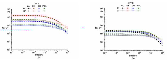 Amplitude sweep at 25 °C (a) and 37 °C (b).