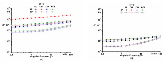 The frequency sweep (Figure 2) was performed at a constant amplitude (in the limit of the linear viscoelastic range γ = 0.01% at 25 °C and γ = 0.05% at 37 °C). The angular frequency varied in the domain 0.1 ÷ 100 rad/s.