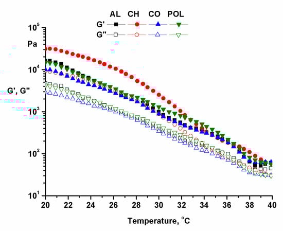 Temperature test was performed at a constant frequency (ω = 10 rad/s) and a constant amplitude in the linear viscoelastic range (γ = 0.01%) with a temperature variation in the range 20–40 °C (Figure 3).