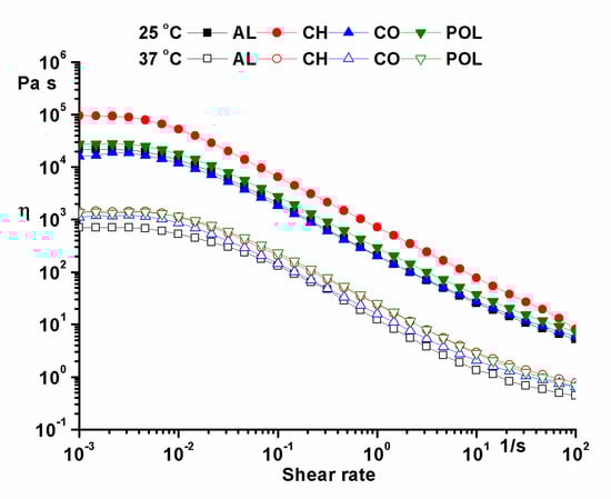 Rotational tests (Figure 4–flow curves) were performed using a shear variation between 0.001 and 100 s−1. The values of zero shear viscosity are listed in Table 1.