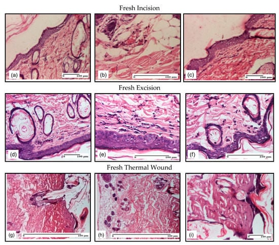 Microscopic histology images of fresh cutaneous wounds models: (a) Rare lymphocytes (S1); (b) Vessel congestion (S1); (c) Hemorrhage in the superficial dermis (S1); (d) Epidermis and dermis with dermal edema and hair follicle ectasia (S2); (e) Light inflammatory infiltrate in the superficial dermis and slight dermal edema (S2); (f) Slight dermal edema and dilatation of the hair follicles (S1); (g) Severe dermal collagenization (S1, D1); (h) Severe dermal collagenization (S1, D1); (i) Severe dermal collagenization (S1, D1). Inflammatory infiltration scoring: S0 (no inflammatory infiltrate), S1 (mild inflammatory infiltrate), S2 (moderate inflammatory infiltrate), S3 (severe inflammatory infiltrate). The thermal burn depths (D): D0—normal skin, D1—epithelial necrosis within the epidermis, the basement membrane remains intact, D2—necrosis of skin appendages and dermal connective tissue; D3—extensive necrosis within the hypodermic tissue.