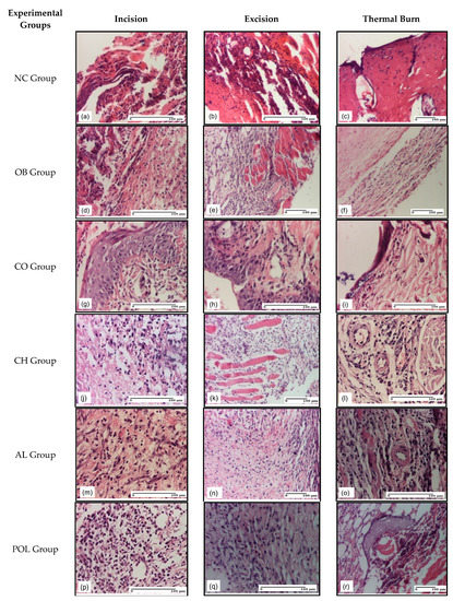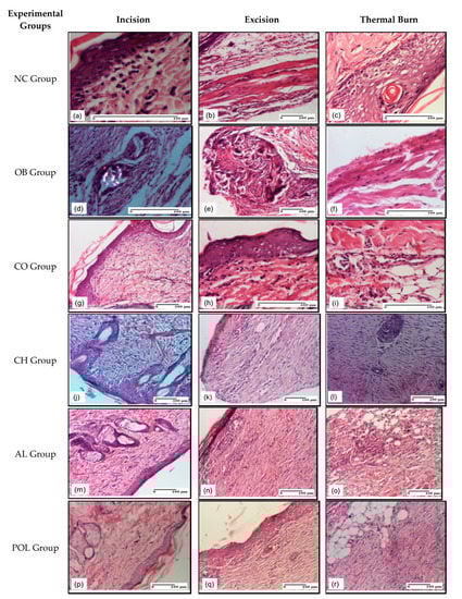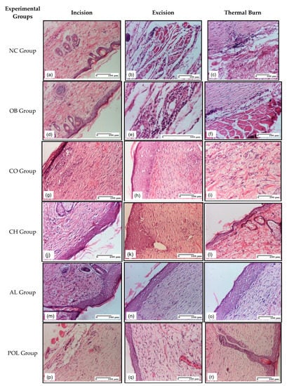 The group treated with chitosan (CH group) revealed inflammation of the epidermis and dermis (incision lesion), inflammation of the hypodermis (thermal burn lesion), and inflammation of the muscular layer (excision lesion) (Figure 6j–l).