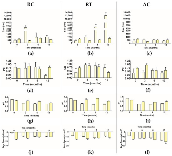 (a–l) Variation of mean size, PdI, pH and zeta potential over the time (0, 3, 6 and 12 months) of empty ethosomes (light yellow columns) and extract-loaded ethosomes (dark yellow columns) using different temperature of storage, namely, RC, RT and AC (mean ± S.D., n = 9).