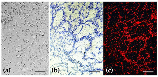 The micrographs obtained with Nile blue support the quantification of lipids determined previously, where the same tendency was observed. In Figure 2c, the amount of red points was significant, revealing an important amount of lipids into the formulation, which corresponds to the phosphatidylcholine (SPC) used.