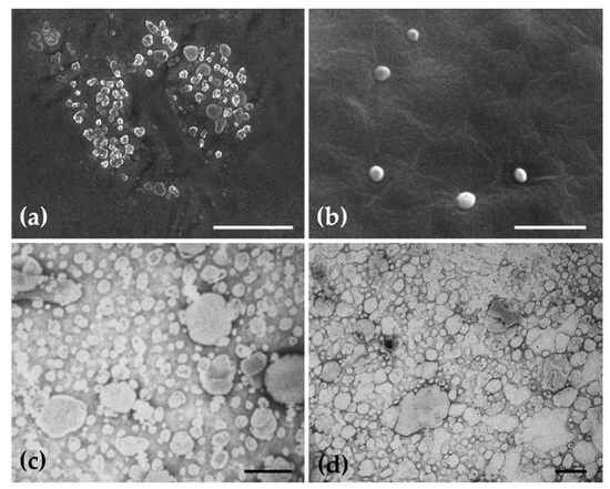 Representative SEM and TEM micrographs showing the morphology of ethosomes. (a,b) SEM images of empty and extract-loaded ethosomes, respectively. (c,d), TEM images of empty and extract-loaded ethosomes, respectively. Scale bars = 5 µm (a); 3 µm (b); 2 µm (c,d).