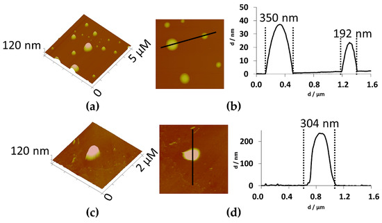 Furthermore, empty and extract-loaded ethosomes were observed by scanning and transmission electron microscopy (SEM and TEM), as well as by atomic force microscopy (AFM). By SEM, all ethosomes presented a spherical or a very near-spherical-shape and a smooth surface (Figure 3a,b). The morphology of ethosomes does not seem to change after entrapment of the extract. TEM observations also showed spherical shaped unilamellar vesicles (Figure 3c,d), confirming the results obtained by Dynamic Light Scattering (DLS). By AFM (Figure 4), another technique and sample treatment, sizes between ca 140 and 350 nm were observed for empty ethosomes, whereas extract-loaded ones exhibited approximately 300 nm, as represented in the cross-section profiles of Figure 4b,d. Overall, the sizes observed by AFM were lower than the ones determined by DLS. AFM generally delivers a high contrast images and signal to noise ratio. However, it can be very sensitive to cleanliness of the samples [19]. In case of DLS, this technique measures Brownian motion and relates to the hydrodynamic diameter. This value refers to how a particle diffused within a fluid and it strongly depends on the particle “core”, particle surface as well the concentration and type of the ions in that medium that forms a double layer. These ions can influence the thickness of the electric double layer. All techniques showed that empty and extract-loaded ethosomes exhibited a spherical or near-spherical-shape, which is a good indicator for the potential topical use, since the surface area versus volume should be high in principle [20].