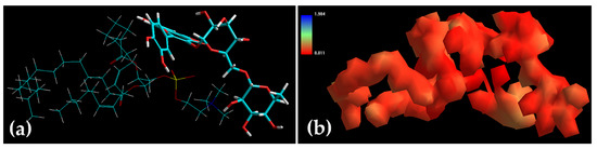 Table 1 displays the inherent molecular energy attributes for various biomolecular complexes (SPC-rutin), while Figure 6 presents the corresponding geometrical positions. Here, the target was the major compound of the extract, rutin. In terms of the overall energy, the SPC-rutin complex was stabilized by the Van der Waals energy and it was accompanied by dihedral and electrostatic destabilizations. Interestingly, this comparatively destabilization of SPC-rutin molecular complex (∆E ≈ −6 kcal/mol) may provide enhanced diffusivity of rutin across the lipidic matrix, in comparison to the polymer-rutin complexes in a previous study performed by our group, where poly-glycolic-lactic acid-rutin and poly-caprolactone-rutin revealed higher molecular complex (∆E ≈ −20 kcal/mol and −18 kcal/mol, respectively) [4]. These chemical interactions might somehow justify the extract entrapment of around 70%, i.e., the interactions are not too strong in terms of energy.