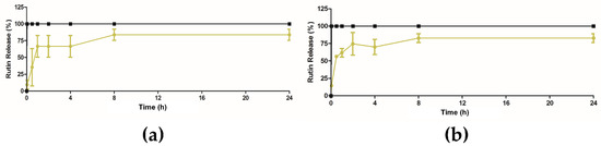 Percentage of rutin release free extract (black line) and extract-loaded ethosomes (yellow line), (a) in PBS pH 5.5, (b) in PBS pH 7.4.