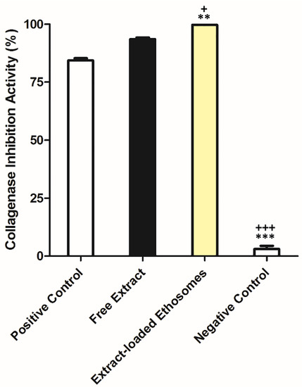 The results obtained for the in vitro collagenase inhibition activity are showed in Figure 8. The free extract (93.57 ± 0.61%) presented higher Coll inhibition activity the positive control (84.36 ± 0.91%). At equivalent concentration of the extract, extract-loaded ethosomes had the highest Coll inhibition activity (99.67 ± 0.09%).