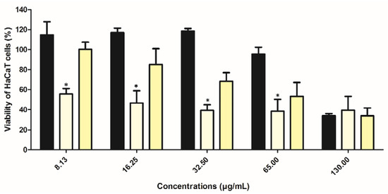 Cell viability (%) of HaCaT following 48 h incubation of free extract (black columns), empty (light yellow columns) and extract-loaded ethosomes (dark yellow columns). Tested concentration ranged from 8–130 µg of rutin/mL (%, mean ± S.D.; n = 6; * p < 0.05, when compared with free extract). Empty ethosomes were used at equivalent concentration of loaded ethosomes.
