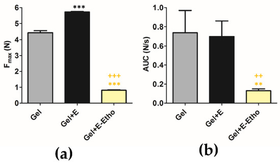 The (a) peak force of displacement (Fmax, N) and the (b) area of the peak (AUC, N/s) obtained from the force versus time curves. The results are presented regarding the mean ± S.D.; n = 3 (** p < 0.01 and *** p < 0.001 when compared with gel (control); ++ p < 0.01 and +++ p < 0.001, when compared with Gel + E).
