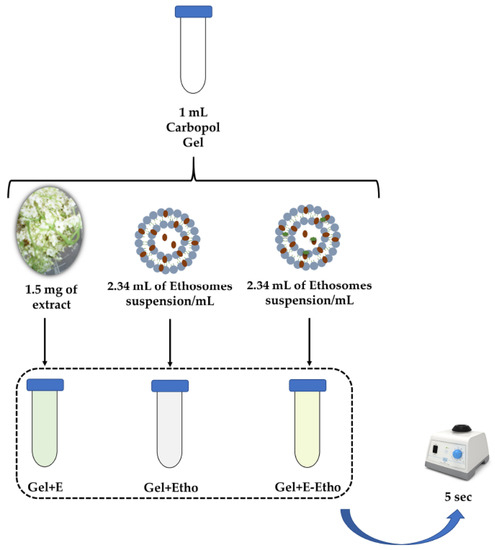 The organoleptic characteristics, pH and viscosity of each sample were evaluated over one week for heating and cooling tests, with analyses in four different times (immediately after the incorporation of the ethosomes into the gels, on the second, fourth and last day). Samples of gel with extract (Gel + E), gel with empty ethosomes (Gel + Etho) and extract-loaded ethosomes (Gel + E-Etho) were compared to the gel (Carbopol® 940 as control). This study reports for the first time that all these combinations were studied by diverse parameters and for different assays over time.