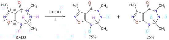The N-deuteration of RM33 resulting in mixture of 6,8-dideuterio-3,5,7-trimethyl-7H-isoxazolo[5,4-e]-1,2,4-triazepin-4-one (about 75%) and 6,7,8-trideuterio-3,5,7-trimethyl-isoxazolo[5,4-e]-1,2,4-triazepin-4-one (about 25%).