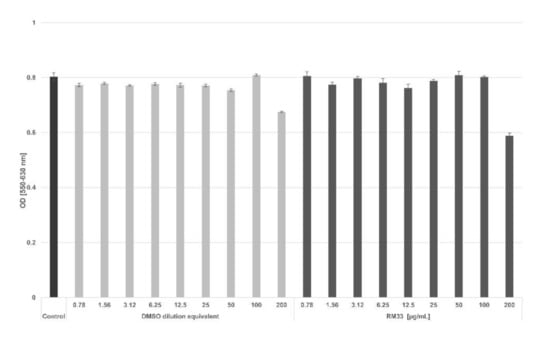 Cell toxicity of RM33 against reference A549 cell line. The test was performed in a monolayer culture of cell line A549 that were incubated at density 5 × 104/well for 48 h. RM33 was tested at the 0.78–200 μg/mL concentration range. Control cultures contained corresponding dilutions of DMSO. The cell viability was determined by the MTT colorimetric assay. The results are presented as OD mean values ± SE from quadruplicate determinations.