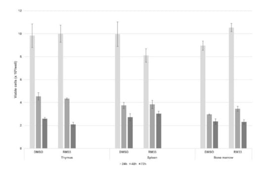 The effect of RM33 on the number of viable of cells from mouse lymphoid organs. Trypan blue dye exclusion method was applied. The number of viable (unstained) cells was determined in a Bürker hemocytometer. The results are presented as number of viable cells (mean values ± SE).