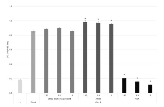 Effect of RM33 on ConA-induced mouse splenocyte proliferation. Splenocytes were distributed into tissue culture plates at a density of 2 × 105/100 µL/well. An amount of 2.5 µg/mL ConA was added to induce cell proliferation. RM33 and CsA were added to the cultures at 1.25–5 µg/mL concentration range. After a 3-day incubation, the cell proliferation was determined using the colorimetric MTT assay [36]. The results are presented as the mean OD ± SE from quadruplicate determinations, * p < 0.05 (ANOVA; vs. DMSO dilution equivalent).
