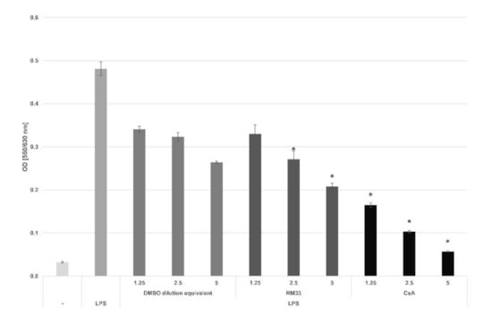 Effect of RM33 on LPS-induced mouse splenocyte proliferation. Splenocytes were distributed into 96-well flat-bottom tissue culture plates at a density of 2 × 105/100 µL/well. LPS (50 µg/mL) was added to induce cell proliferation. RM33 and CsA were added to the cultures at 1.25–5 µg/mL concentration range. After a 3-day incubation, the cell proliferation was determined using the colorimetric MTT assay. The results are presented as the mean OD ± SE from quadruplicate determinations, * p < 0.05 (ANOVA; vs. DMSO dilution equivalent).