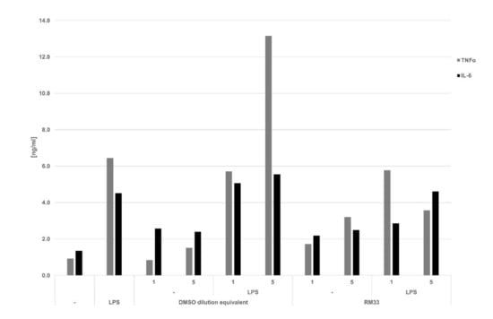 Effect of RM33 on LPS-induced cytokine production by rat peritoneal cells. Peritoneal cells were incubated overnight in 24-well culture plates containing 5 × 106 cells/mL. LPS was applied at concentration of 1 µg/mL and RM33 at 1 and 5 µg/mL. Control cultures contained appropriate dilutions of DMSO, corresponding to DMSO dilutions at respective RM33 doses. The determination of TNFα and IL-6 was performed by bioassays [38,39]. The results are presented in ng/mL.