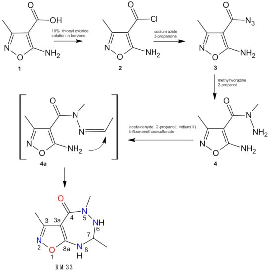 Hydrazide 4 was obtained in a reaction of 5-amino-3-methylisoxazole-4-carboxylic acid azide with methylhydrazine, according to the method described in [25]. The final RM33 was synthesized in two steps through intermediate product, i.e., N-acylhydrazone 4a, which was formed in the nucleophilic addition reaction of terminal NH2 group of hydrazide 4 to carbonyl carbon of acetaldehyde. In second step intermediate 4a was cyclized as a result of reaction of intramolecular nuclephilic addition of isoxazole amine group (aza-Michael type reaction) to hydrazone carbon catalyzed by indium (III) trifluoromethanesulfonate.