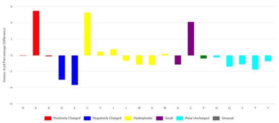 Amino acid composition of ribosomal peptides of DBAASP presenting as the difference from UniProt (https://dbaasp.org/statistics, accessed on 20 March 2021).