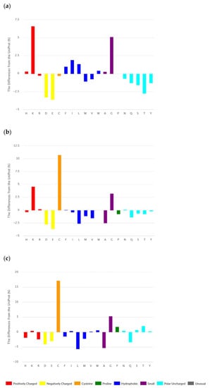 Amino acid composition of (a) linear; (b) disulfide-bonded, and (c) cyclic ribosomal peptides of DBAASP, presented as the difference from UniProt (https://dbaasp.org/statistics, accessed on 20 March 2021).