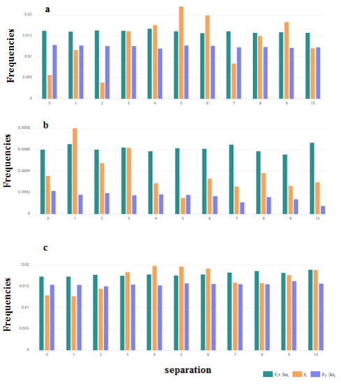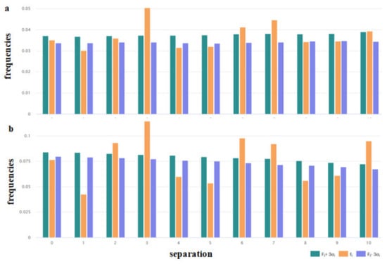 Frequencies of the appearance of pairs of (a) positively charged residues (R, K, H) and (b) hydrophobic residues (V, I, L, F, M) with the i residues (i = 0, 1, 2,…, 10) between them. fi- Observed frequencies; Fi- the average value of the frequencies assessed on the base of random sequences, and σi are their standard deviations. Fi frequencies are estimated for random sequences generated by shuffling of the sequences of the considered set of peptides. The assessments were performed using the tools of the page of “Statistics” (https://dbaasp.org/statistics, accessed on 20 March 2021) of the DBAASP [17].
