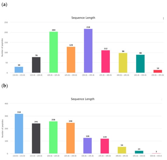 AMP’s lengths distributions for: (a) disulfide-bonded and (b) linear peptides (according to the data of DBAASP (https://dbaasp.org/statistics, accessed on 20 March 2021).