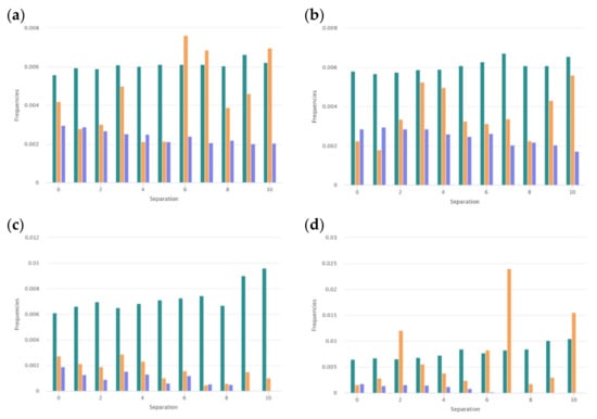 Frequencies of the appearance of pairs of amino acid with the i residues between them, for: (a) Gly-Pro in the set of short (17–30 aa) linear ribosomal AMPs; (b) Pro-Gly in the set of short (17–30 aa) linear ribosomal AMPs; (c) Gly-Pro in the set of very short (10–15 aa) linear ribosomal AMPs; (d) Pro-Gly in the set of very short (10–15 aa) linear ribosomal AMPs. The assessments have been performed using the tools of the page of “Statistics” (https://dbaasp.org/statistics, accessed on 20 March 2021) of the DBAASP [17].